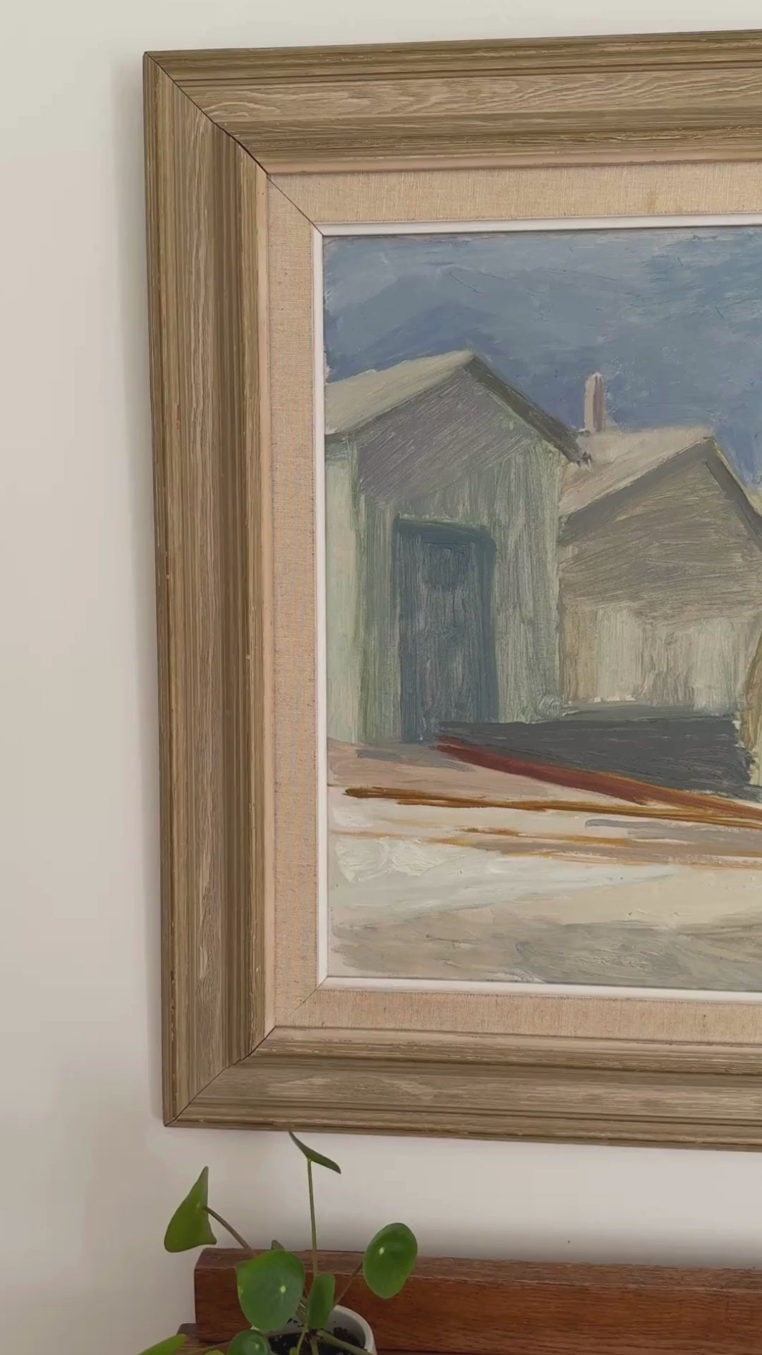 A midcentury original painting representing a group of houses by the beach. Oil on canvas, signed and dated (1954).