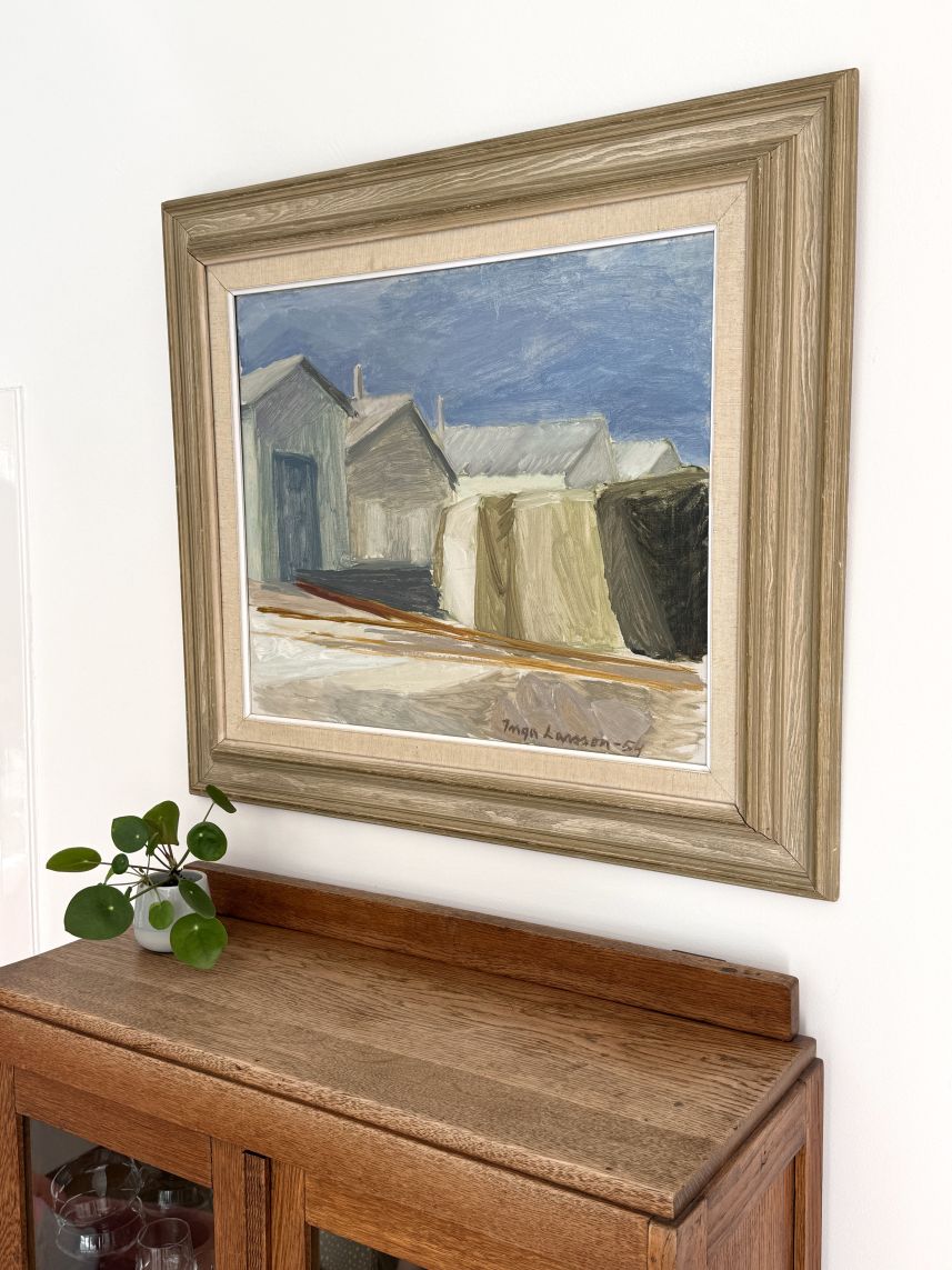 Female painter Inga Larsson created an atmospheric coastal scene with pastel colored houses on the edge of the beach. With only a few well placed brush strokes, she combines warm ochre and yellow tones with cool blues and grays for the shadows and the sky.