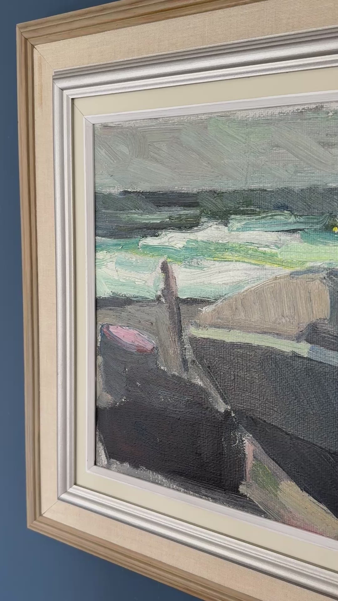 Abstract modernist oil painting of a two boats on land, with a wild and wavy sea in the background. Oil on canvas, signed.