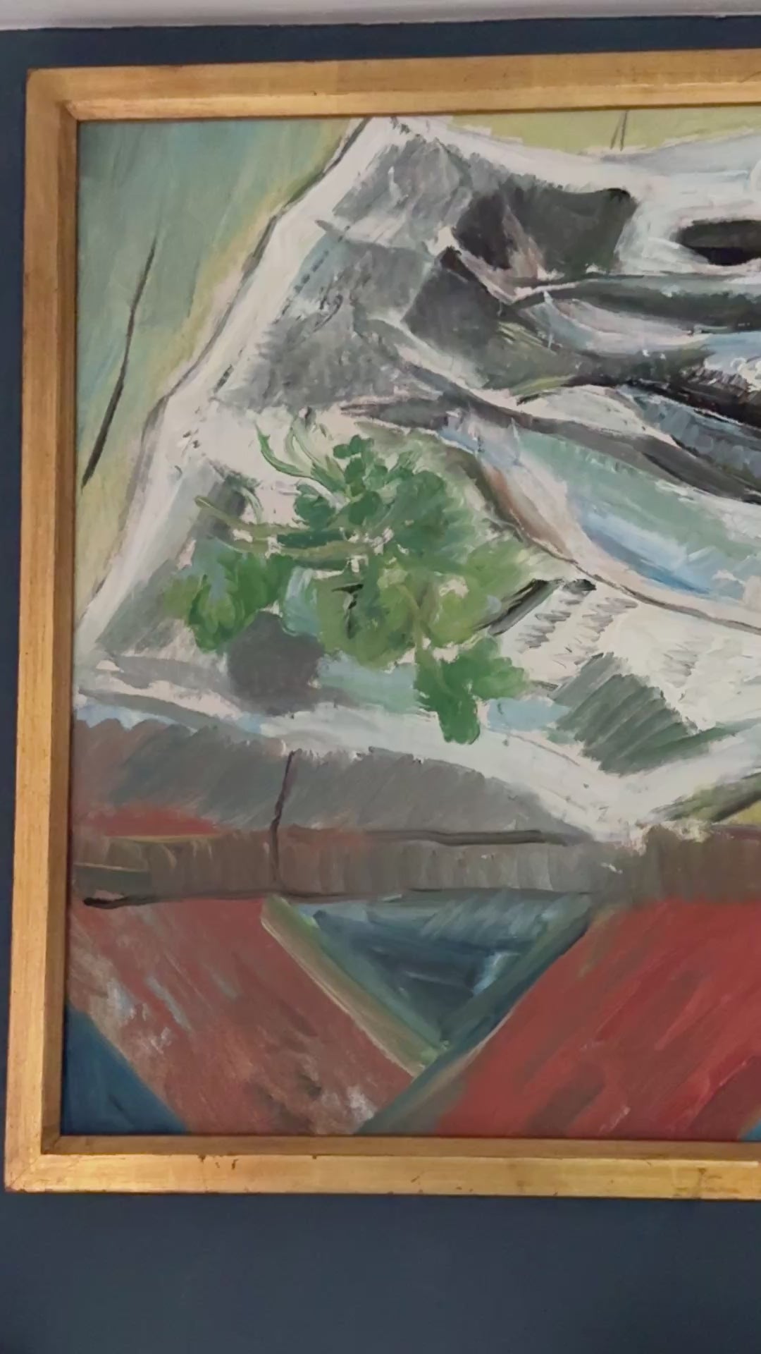 Expressionist vintage oil painting of some fresh herring in a piece of paper on a table. Oil on canvas, signed.