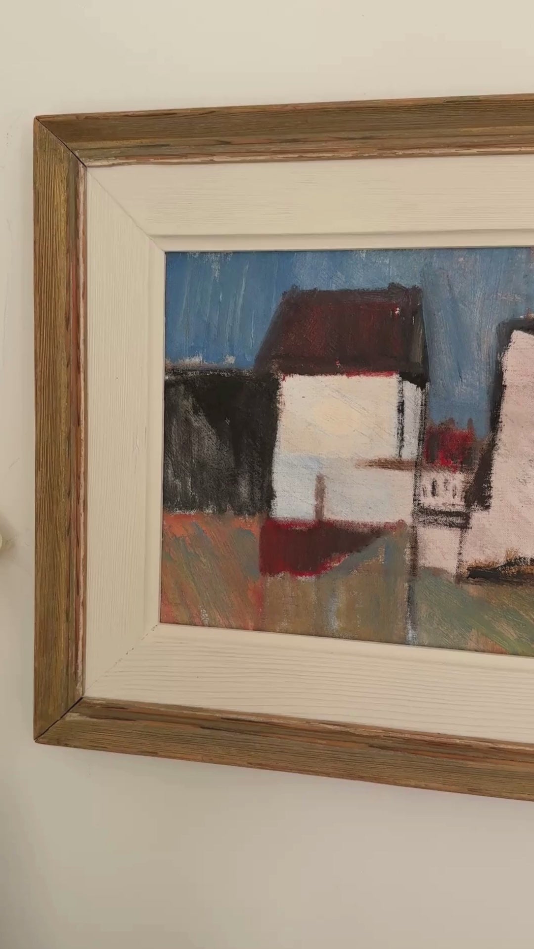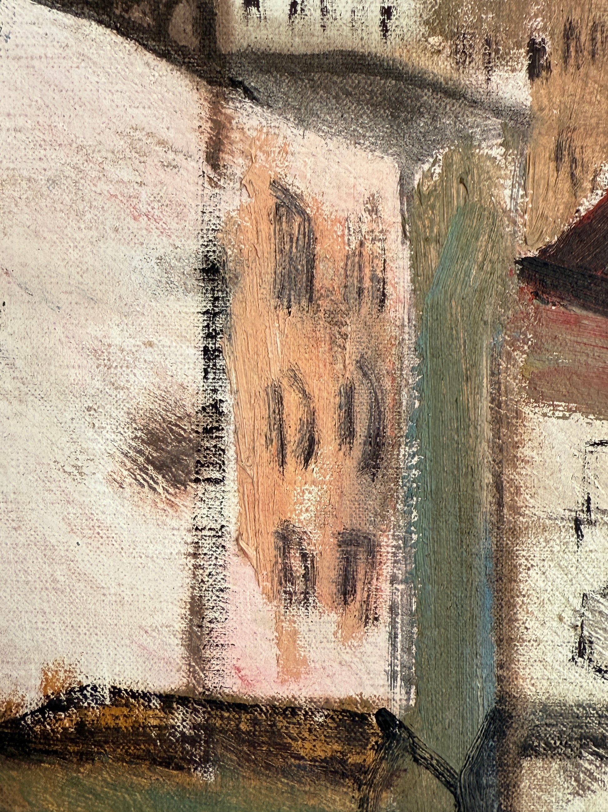 Hult (1922- 2012) painted this charming scene with just a few strokes of black paint, laying out the of contours of the town. Added blues, reds, greens and even some pinks created a layered piece of art.
