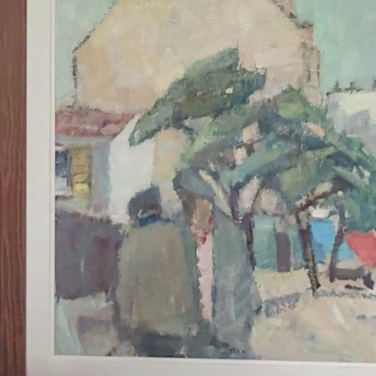 Impressionist painting of a colorful small town with people and trees. Oil on canvas, signed.