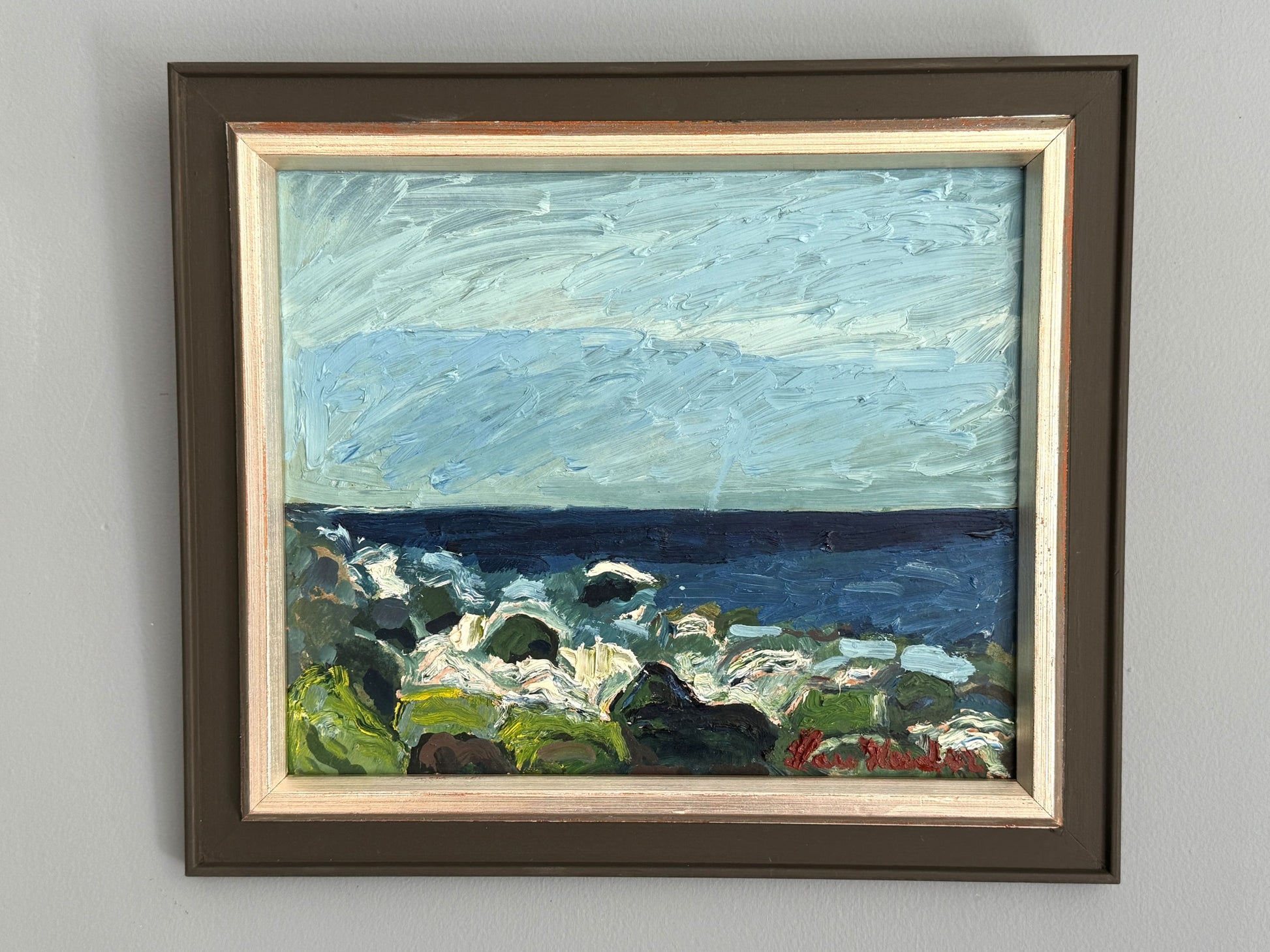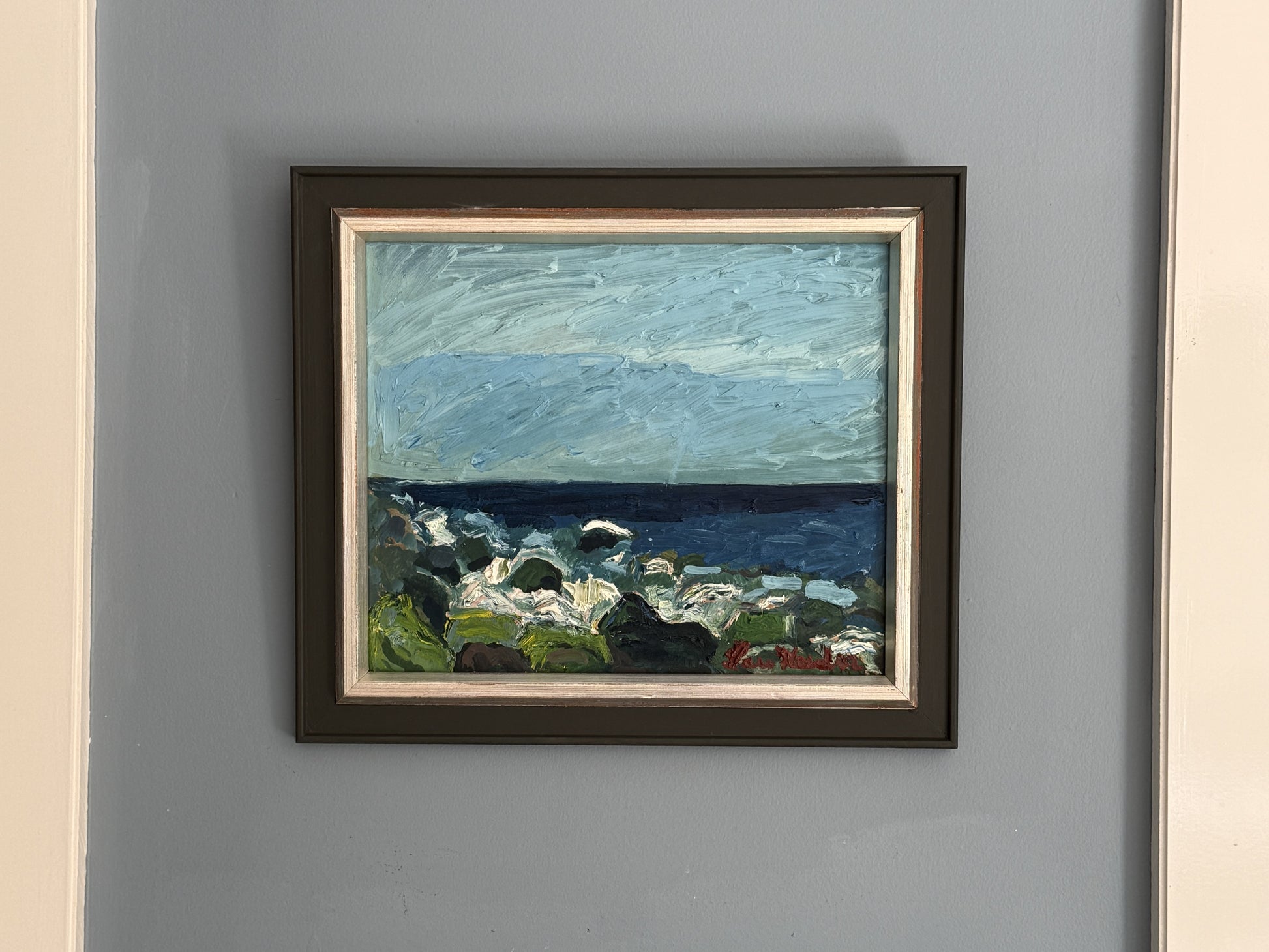 With rough brush strokes and a lot of paint, Lars Herder (1923-1976) created this rugged coastal landscape. Using mostly blues and some greens, whilst adding some (almost) black to create a layers between the rocks. Bright white and some hints of pink depicts the foam of the waves.
