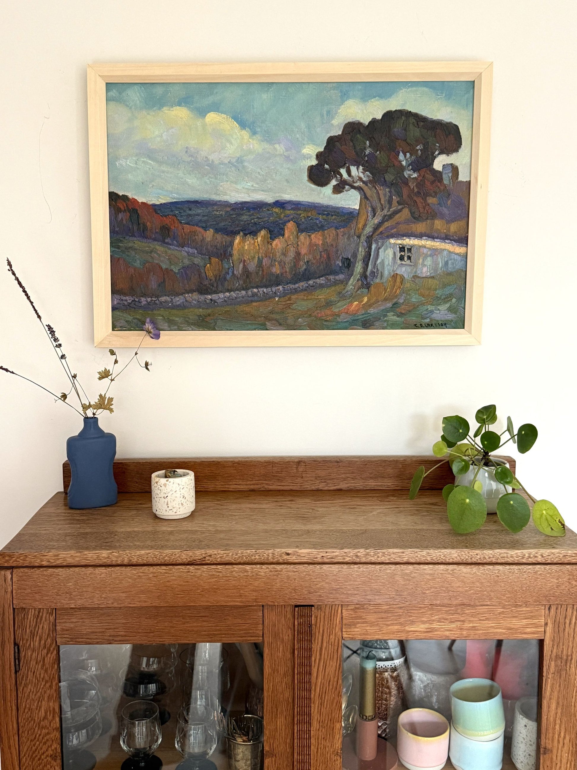 The painting is surface cleaned and comes with a complementary (new) wooden frame. The painting is in good vintage condition but shows some age-related wear and tear, which largely contributes to its charm. The best way to see this is through the photos, so study them because they form the description.