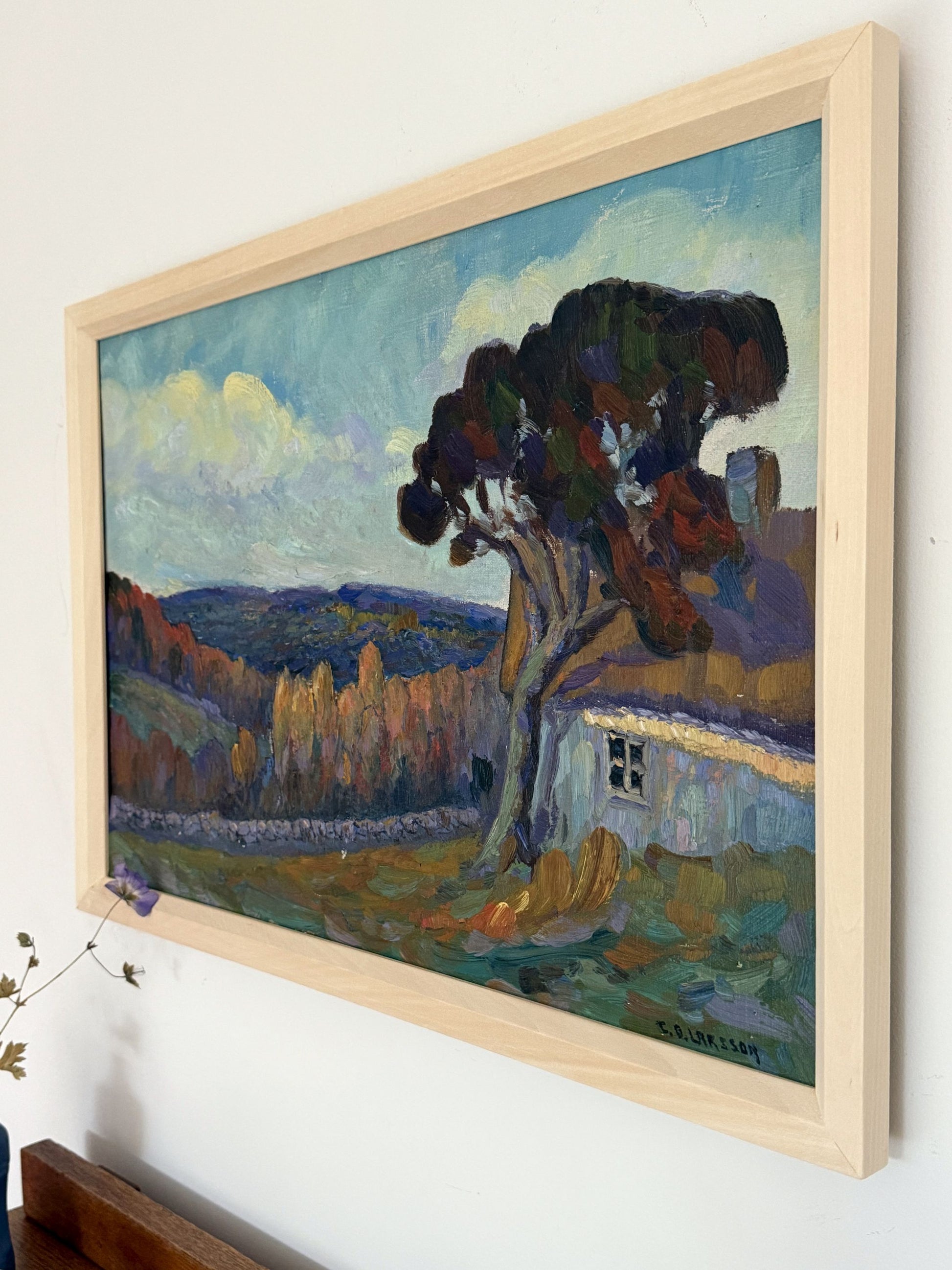 Striking impressionist oil painting of a valley with a tree and a shed. Oil on canvas, signed.